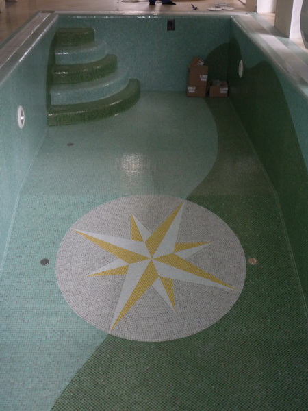 Для отделки чаш бассейнов применяют специальные смеси для плиток разных цветов, как привило, голубых, синих и белых тонов. Смеси "Mapei" для монтажа плитки и мозаики, прочны и эластичны. Они надежно удерживаются на заранее подготовленной поверхности. Кроме того, эти смеси обладают гидроизоляционными свойствами. Перед укладкой плитки и особенно мозаики необходимо обеспечить идеально ровную поверхность основания, иначе все неровности чаши проявятся на поверхности панно.