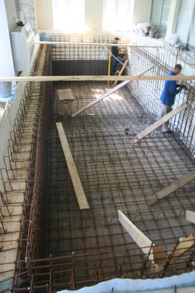Размеры котлована определяются из размеров предполагаемого бассейна, местной геологии и грунтовых вод на участке. Как котлован готов требуется песочно-гравийная отсыпка толщиной 100-150 мм.. Далее изготавливается армированная бетонная подушка толщиной 100-200 мм. Марка бетона М250.