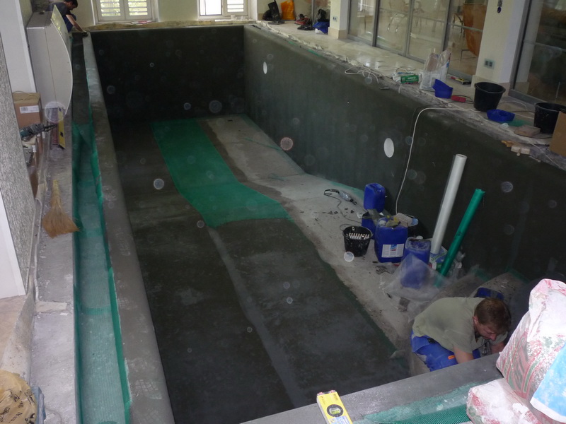 Бассейн - сооружение с различными динамическими нагрузками, где не исключено образование трещин в бетоне. Поэтому главная задача - нанести на поверхность чаши эластичное гидроизоляционное покрытие, выдерживающее раскрытие трещин. Сегодня на рынке представлено огромное количество разнообразных гидроизоляционных материалов. Наша компания "Тритон Аква" использует только высококачественные материалы итальянской компании "Mapei". Mapelastic наносят в два слоя (по 1 мм). На первый слой Mapelastic -а поверх трещин для усиления накладывают специальную стекловолокнистую ткань (ячейки 4х4 мм) с нахлестом в 10 см. После высыхания первого слоя герметика (через 4-5 часов) наносят второй слой. В заключение поверхность разравнивают полутеркой или металлической гладилкой. Время затвердевания Mapelastic при +20 С составляет около 24 часов. Расход составляет 1,7 кг/кв.м/на мм толщины.